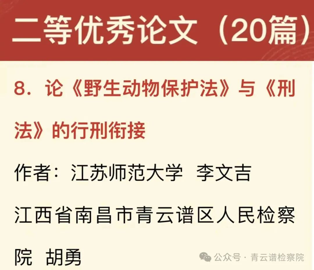 为深入贯彻习近平生态文明思想和习近平法治思想,促进生态环境检察理论与实践深度融合,最高人民检察院普通犯罪检察厅、最高人民检察院公益诉讼检察厅、人民检察杂志社、华东政法大学于今年7月联合开展“两山”理念指引下的生态环境检察理论与实践征文活动。近日,征文活动结果揭晓,我院党组成员、检委会专职委员胡勇与江苏师范大学李文吉博士合写的论《野生动物保护》与《刑法》的行刑衔接荣获征文活动二等奖。