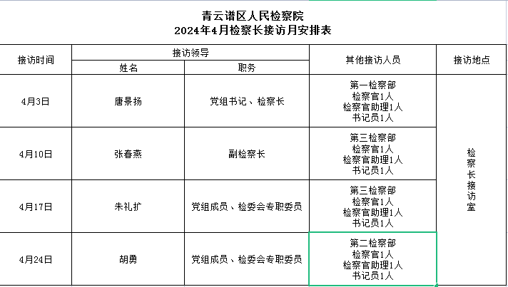 为深入贯彻习近平法治思想,倾听群众心声,解决群众诉求,提升我院控告申诉工作质效,扎实做好检察长接访工作,现将青云谱区人民检察院2024年4月检察长接访安排如下: