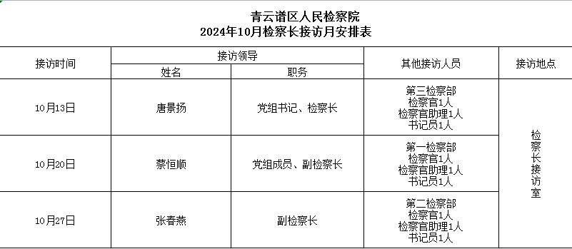 为深入贯彻习近平法治思想,倾听群众心声,解决群众诉求,提升我院控告申诉工作质效,扎实做好检察长接访工作,现将青云谱区人民检察院2024年10月检察长接访安排如下: