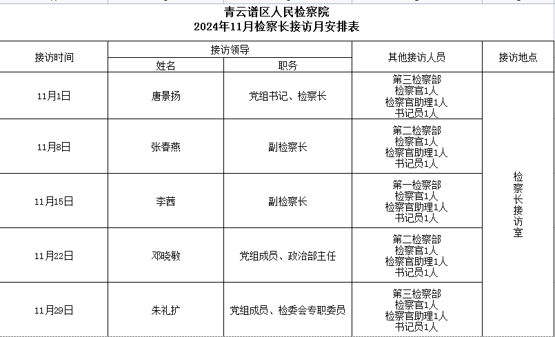 为深入贯彻习近平法治思想,倾听群众心声,解决群众诉求,提升我院控告申诉工作质效,扎实做好检察长接访工作,现将青云谱区人民检察院2024年11月检察长接访安排如下: