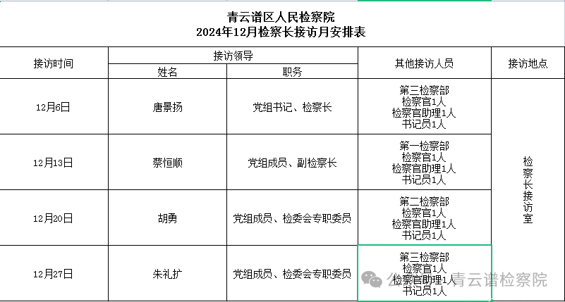 为深入贯彻习近平法治思想,倾听群众心声,解决群众诉求,提升我院控告申诉工作质效,扎实做好检察长接访工作,现将青云谱区人民检察院2024年12月检察长接访安排如下: