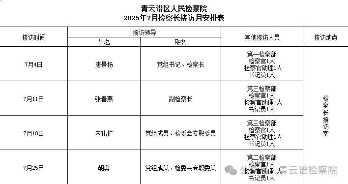 为深入贯彻习近平法治思想,倾听群众心声,解决群众诉求,提升我院控告申诉工作质效,扎实做好检察长接访工作,现将青云谱区人民检察院2025年7月检察长接访安排如下: