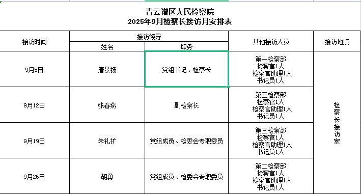 为深入贯彻习近平法治思想,倾听群众心声,解决群众诉求,提升我院控告申诉工作质效,扎实做好检察长接访工作,现将青云谱区人民检察院2025年9月检察长接访安排如下: