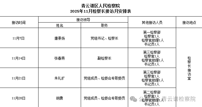为深入贯彻习近平法治思想,倾听群众心声,解决群众诉求,提升我院控告申诉工作质效,扎实做好检察长接访工作,现将青云谱区人民检察院2025年11月检察长接访安排如下: